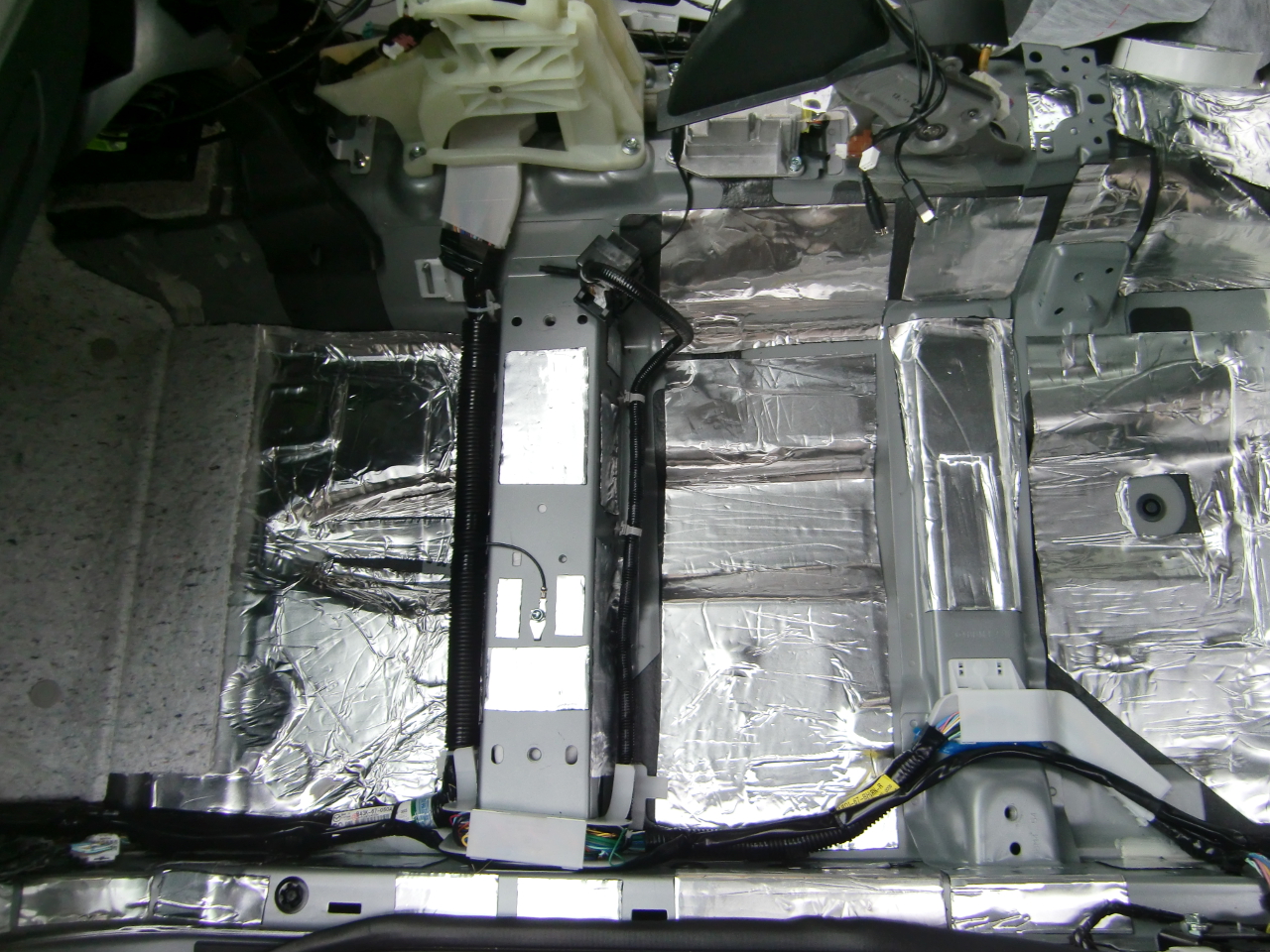 - 前席足元にはノーマル状態で発泡スチロール&ニードルフェルトが取り付けてあったので,今回はその上への遮音材(シャオンスター)&吸音材(シンサレート)設置とした。
