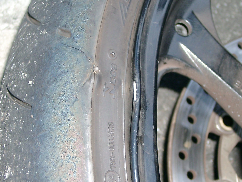 それは朝練に行った日のこと。まだ薄暗いお山の中を走り始めた最初の一本目,突如フロントにガツンと衝撃が!(なにか踏んづけた!?) 暴れる車体をどうにか落ち着かせていつもの場所でUターンし,そのポイントまで引き返すと,やっぱりあったよ落石が。ハンドリングも変わらないのでしばらく周回(さすがに落石ポイントはラインを変えて)を続けた後,休憩に戻ったところでタイヤの確認だ。ありゃ~,と声を上げたのが右画像のような状態。エア漏れはないもののリムまで曲がってる。修正に出すって手もあるが気持ち悪いので潔く交換(夢のマグとかアルミ鍛造...現実は,純正品)する事にしよう。ヤフオクをチェックしなけりゃ...