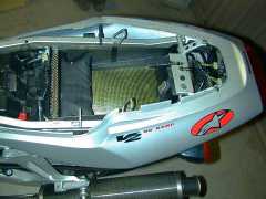 FireStormオーナーズクラブで情報を入手した「アールズギア」製テールトランクを装着。ノーマルでは車載工具収納スペース以外にはほとんど余裕がないシート下だけど,このテールトランクを取り付ける事により出現する広大な空間(^^)v これで各種ガラクタの収納もカンペキ?さらには,見た目に重たいリアフェンダーもすっきりさっぱり,カーボン製で軽量化にも貢献するしでこれはお勧めアイテム